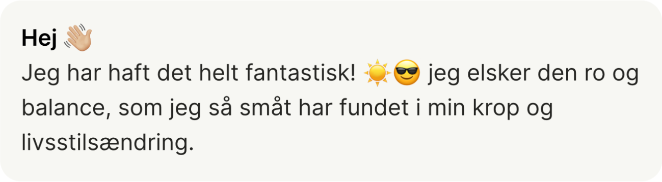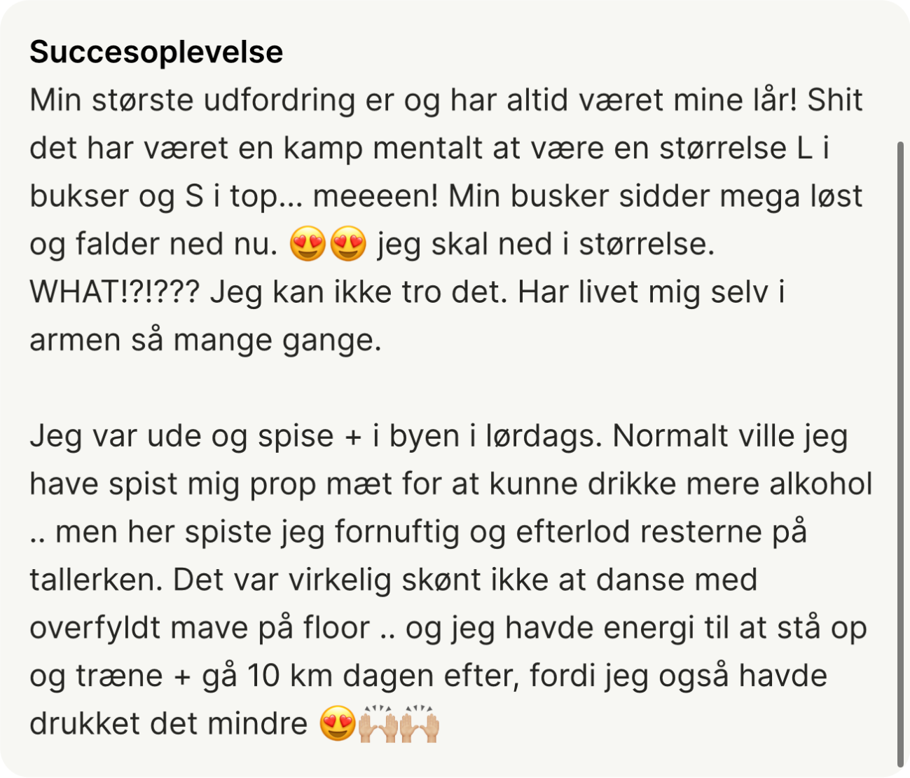 Men med en plan der passede til hendes liv, mad hun glædede sig til, og støtte der holdt hende på sporet, begyndte alt at vende. Hun tabte sig markant på bare 8 uger, fik energien tilbage, sov bedre og havde pludselig overskud uden at være afhængig af sukker eller koffein.